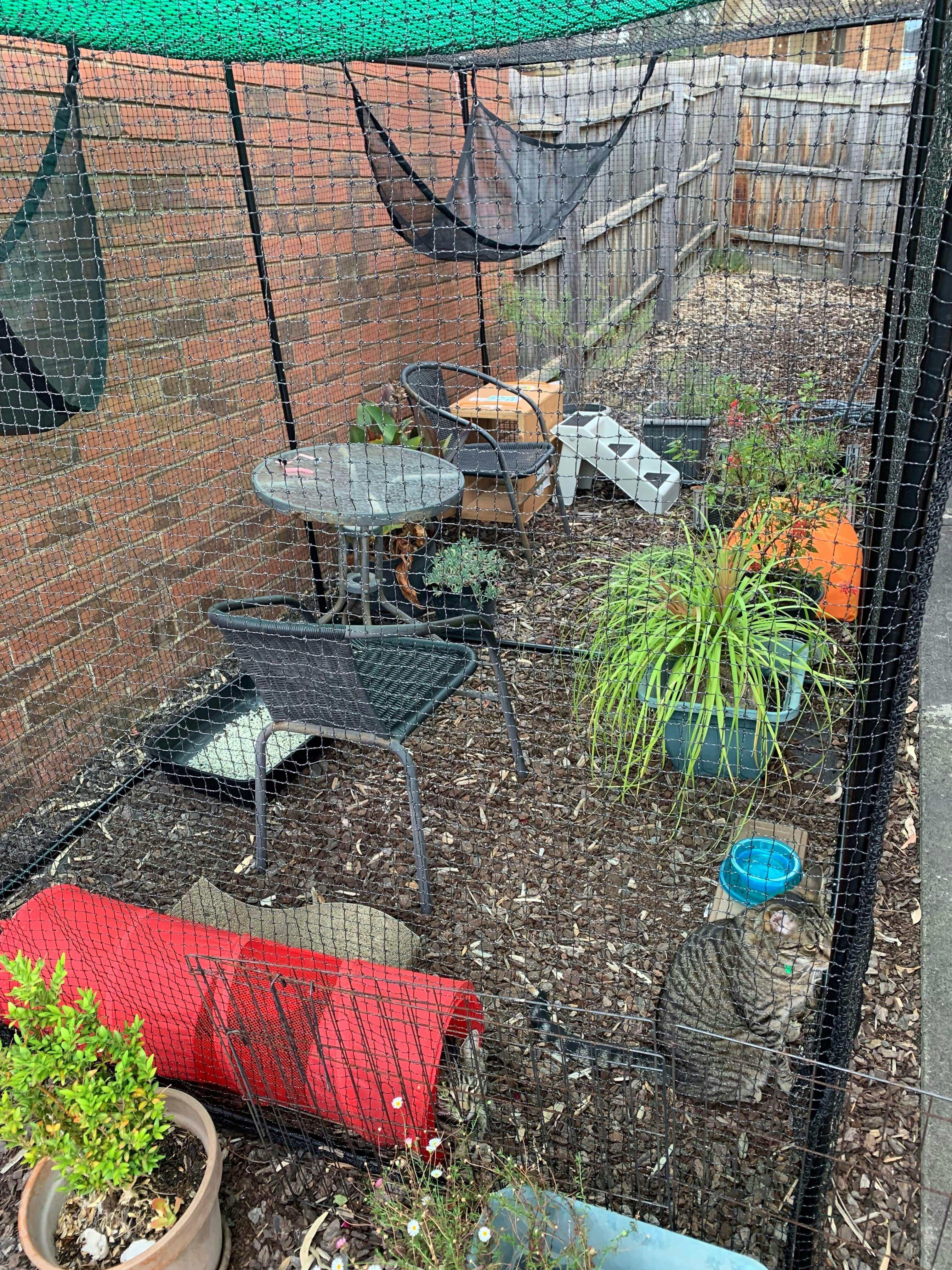 Oliver and Fern are rescues from the RSPCA and had been confined to the house up until now! I feel so much better being able to let them indulge in their natural instincts of hiding in the grass and stalking everything, but having the safety of the netting so the wildlife is still safe. Even the Willy Wagtails come right up and tease them😆. Such a fantastic set up, ridiculously easy to set up but so sturdy. They absolutely love the hammocks and the shade sails fit so perfectly. People have commented how it actually brings the backyard to life as it just looks so good. I even set up fairy lights so they can stay out later.